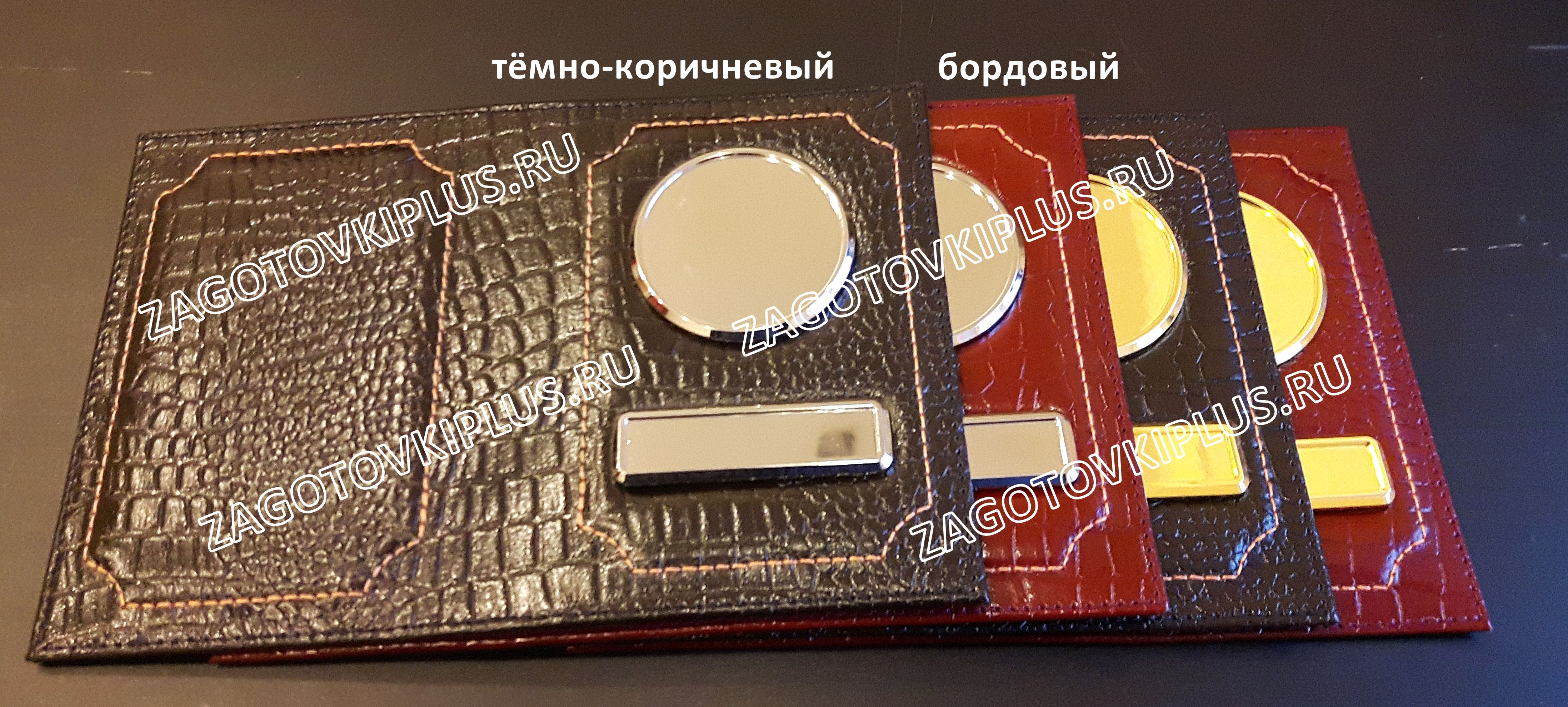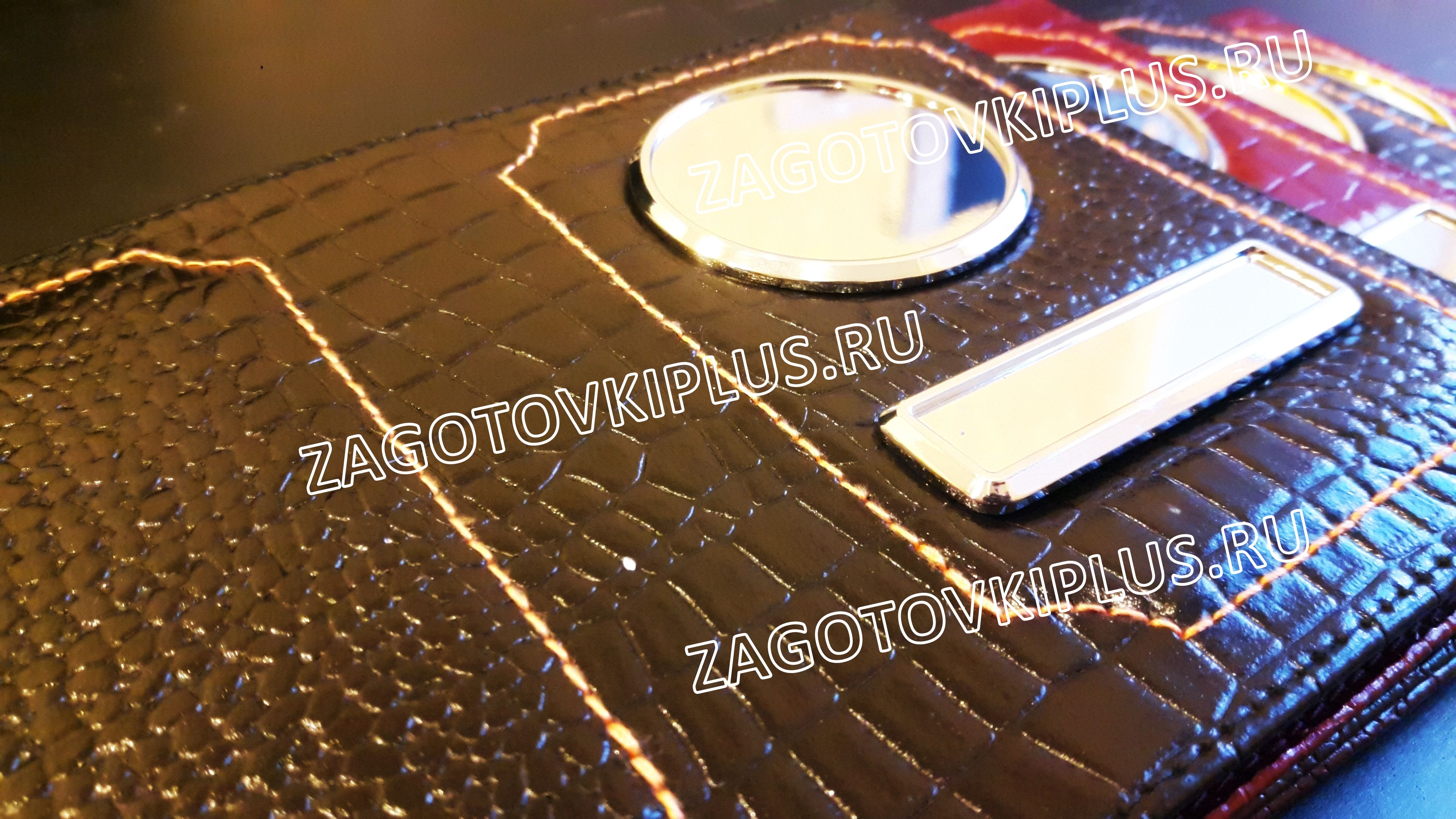 Обложки сделаны из натуральной кожи крокодила. Заготовки обложек имеют специальные металлические вставки с бортиками, которые не темнеют и не облезают. Благодаря этим бортикам изображение защищено от механических воздействий, а полиуретановая линза защищает картинку от выгорания и стирания.Изготовление кожаной обложки занимает 5 минут и не требует специального оборудования. Макет для обложки распечатывается на цветном струйном принтере на самоклеющейся фотобумаге, далее к распечатанному изображению приклеивается линза и вся эта "конструкция" вырезается ножницами и убрав защитный слой с самоклейке вклеивается в металлическую вставку с бортиками. Эксклюзивная обложка для авто документов с гос номером и логотипом готова!