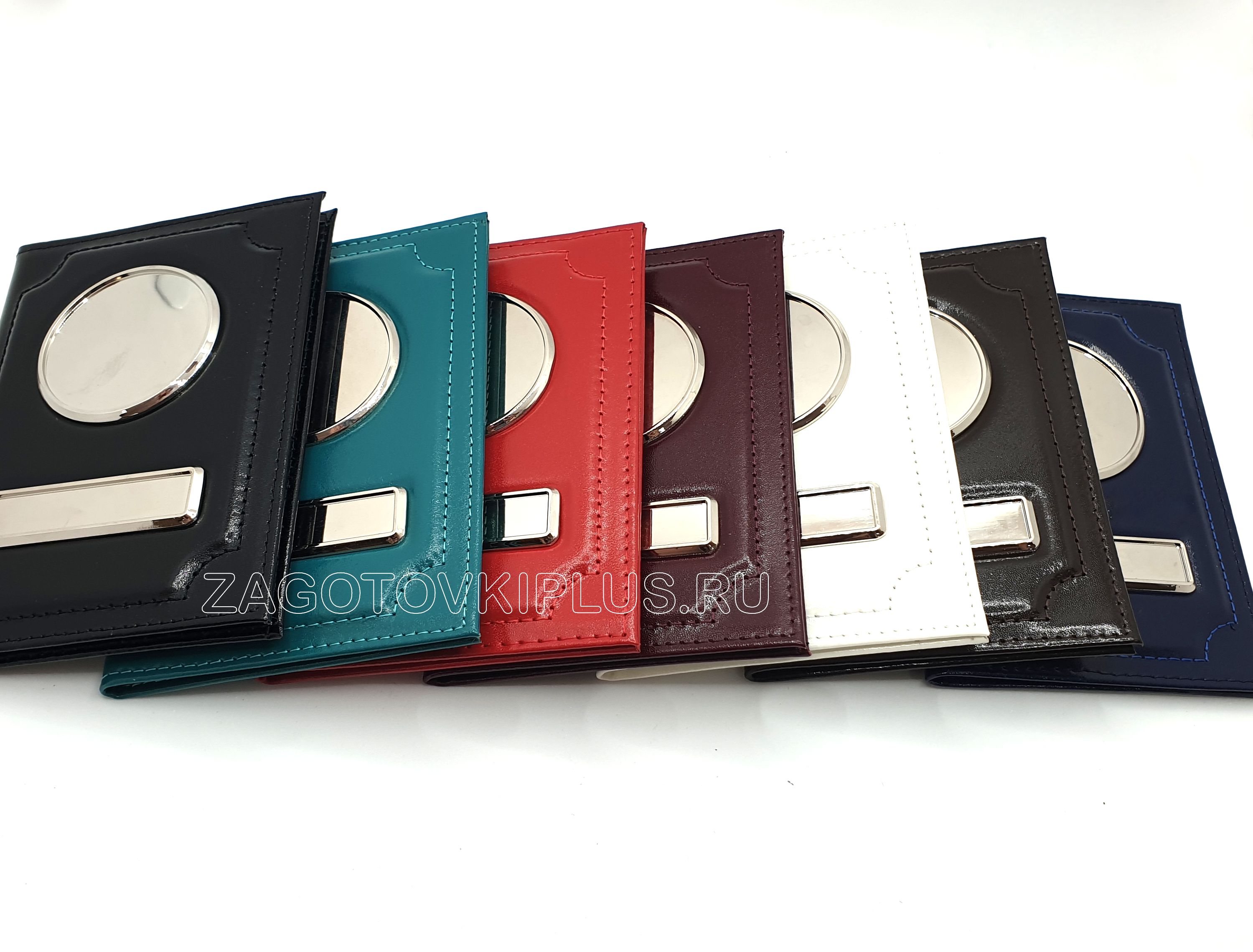 Обложки сделаны из натуральной глянцевой кожи. Заготовки обложек имеют специальные металлические вставки с бортиками, которые не темнеют и не облезают. Благодаря этим бортикам изображение защищено от механических воздействий, а полиуретановая линза защищает картинку от выгорания и стирания.