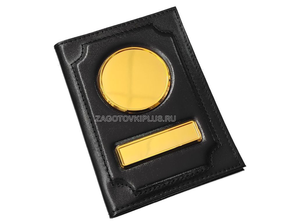 Обложка чёрная из нат. глянцевой кожи без надписи для авто документов с линзами (золотые вставки)