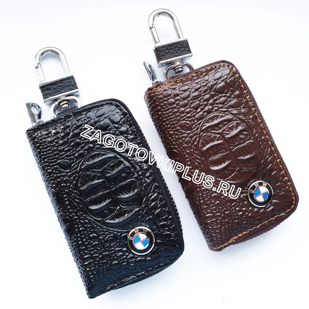 Ключница сделана из натуральной кожи с фактурой под кожу каймана и украшена хромированным логотипом автомобиля.