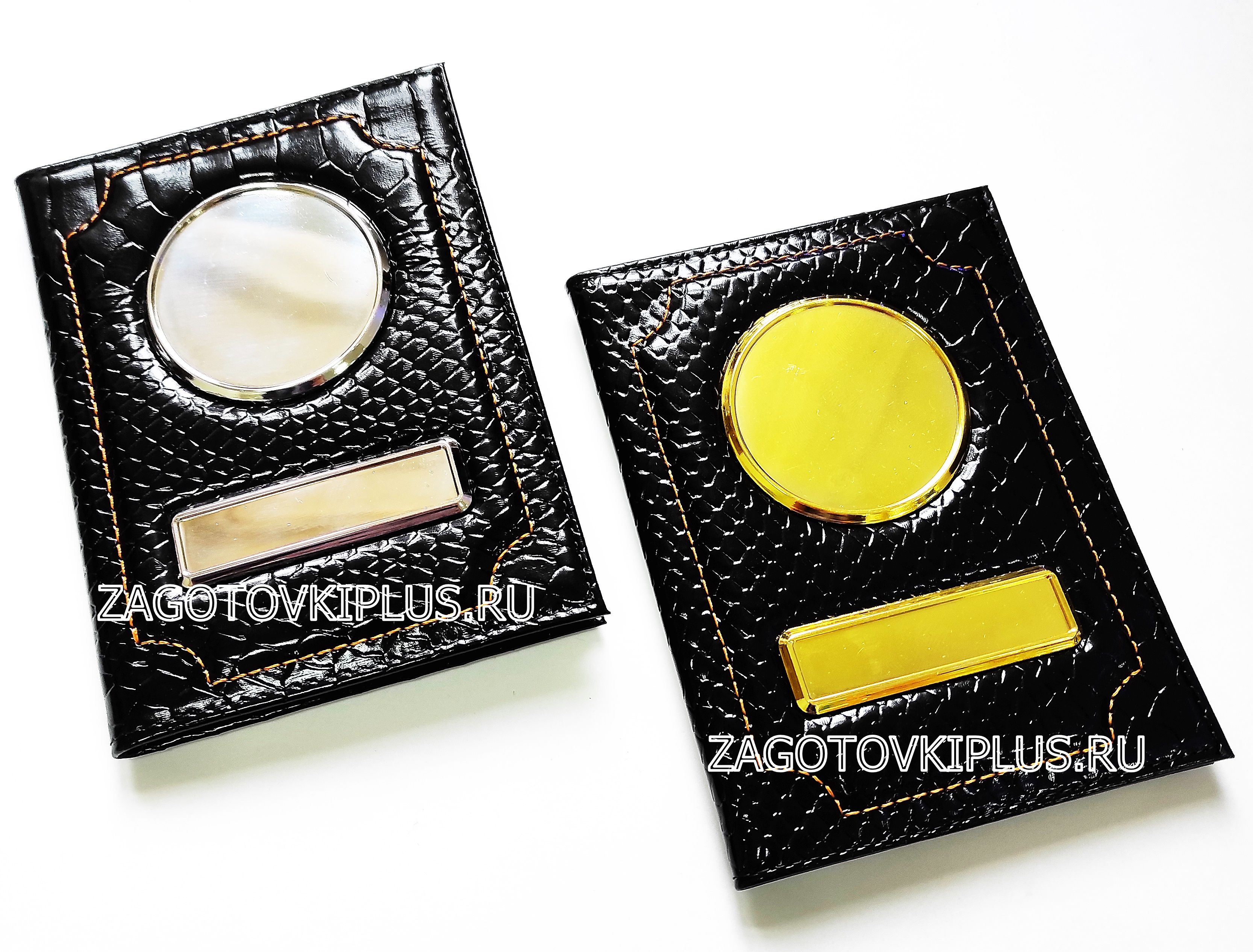 Обложки сделаны из натуральной кожи "питон". Заготовки обложек имеют специальные металлические вставки с бортиками, которые не темнеют и не облезают. Благодаря этим бортикам изображение защищено от механических воздействий, а полиуретановая линза защищает картинку от выгорания и стирания.