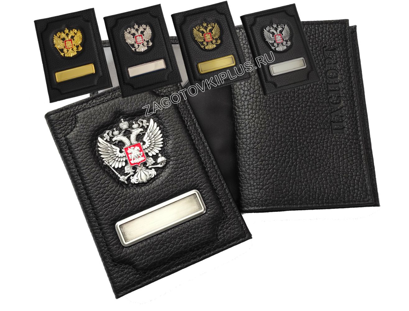 - обложка из премиальной кожи флотер (натуральной матовой ребристой) на автодокументы + паспорт с металлическими вставками герб России и прямоугольник