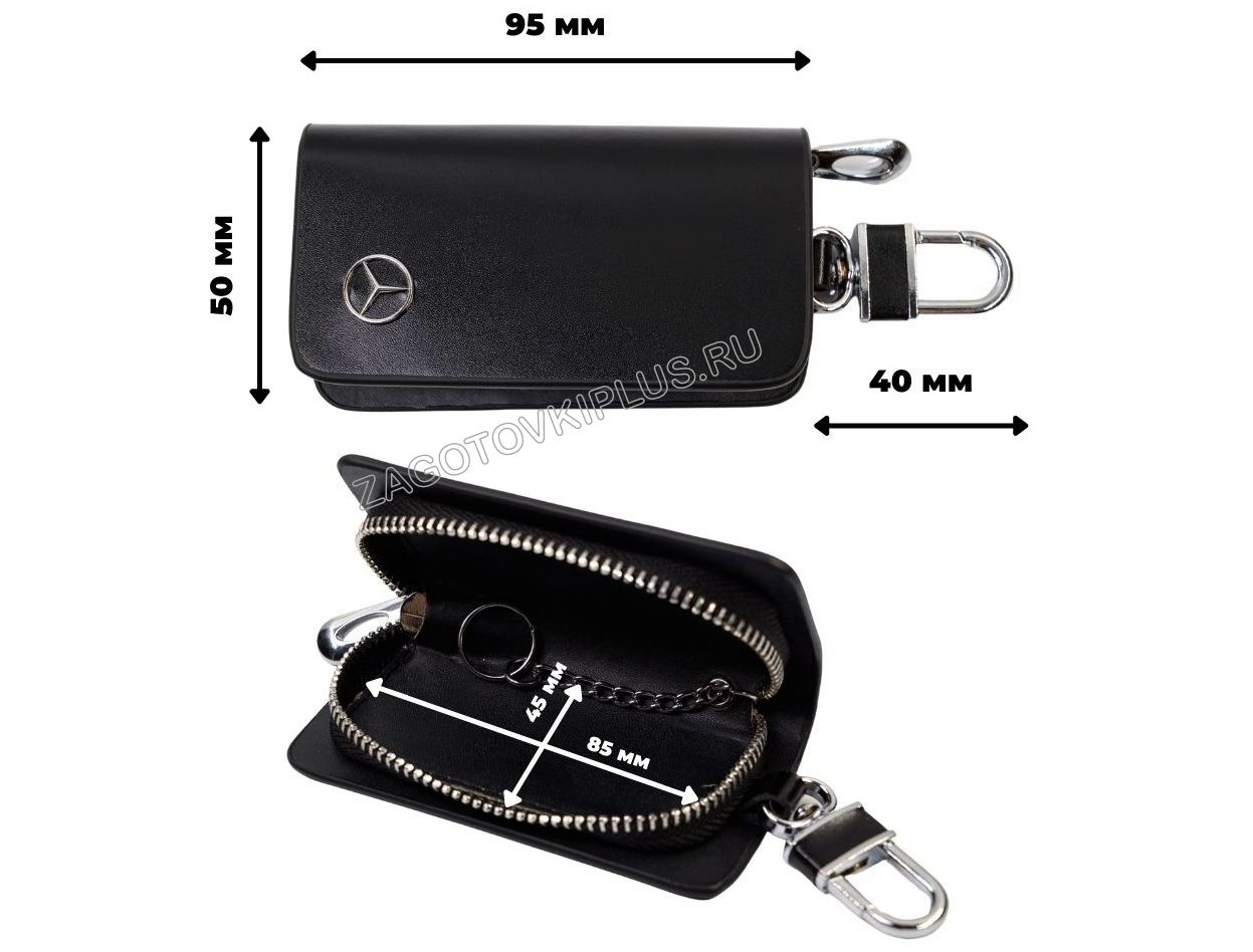 Ключница сделана из натуральной чёрной гладкой кожи и украшена хромированным логотипом автомобиля.