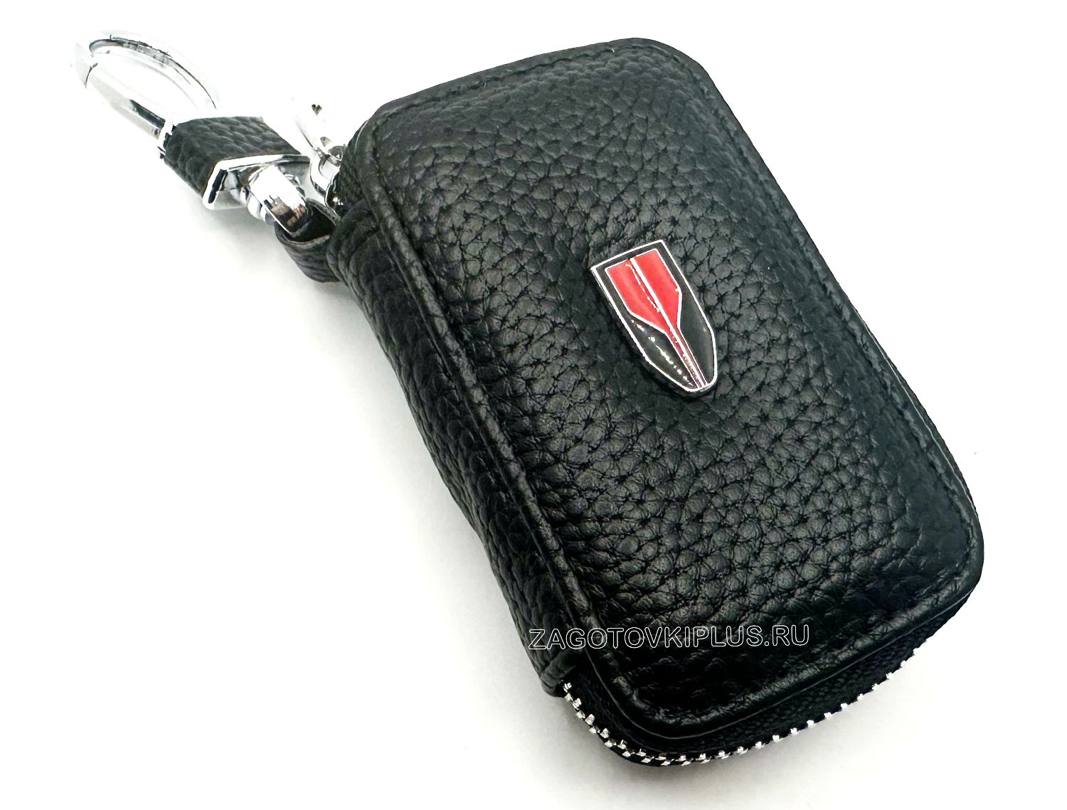 Ключница сделана из натуральной чёрной кожи флотер с чёрной строчкой и украшена хромированным логотипом автомобиля.